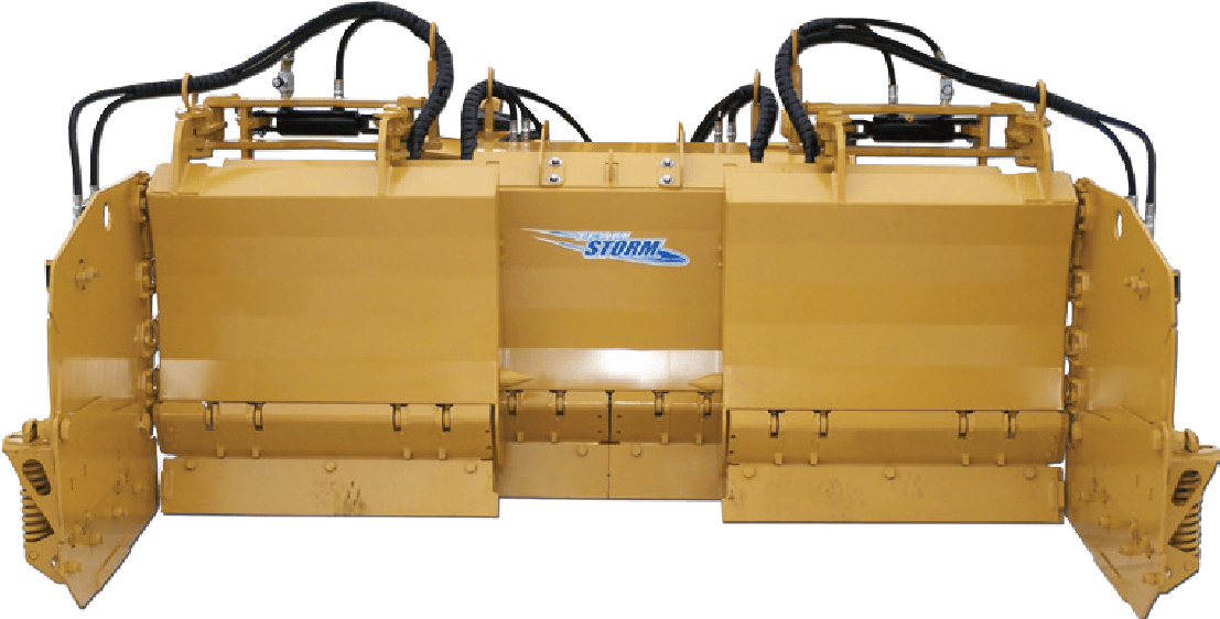 Extendable snow plow blade with hydraulic wings and angle. The ExtendMaxx is installed in front of a tractor with a Universal Subframe exclusive to Metal Pless.